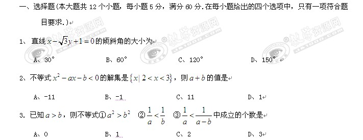 四川省泸州天立国际学校10-11学年高二上学期期中考试(数学文)