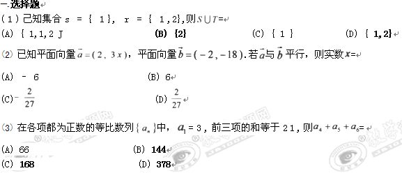 2011年云南省第一次高中毕业生复习统一考试(数学文)