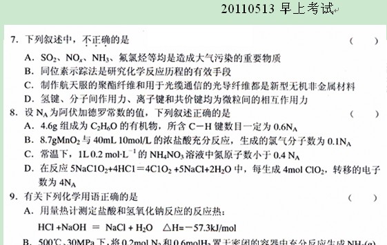 浙江省名校新高考研究联盟2011届高三第二次联考(理综化学)扫描版