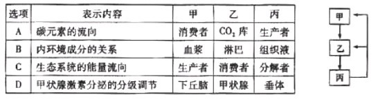 CO2,又能通过呼吸作用释放CO2进入大气,故乙与丙是双向箭头;消费者以生产者为食,碳元素由生产者流向消费者,呼吸作用产生的CO2释放到大气中,A正确。内环境成分中血浆与组织液相互渗透,双向箭头;组织液形成淋巴,淋巴通过淋巴循环汇入血液循环。生态系统的能量流动是单向的。甲状腺激素分泌的分级调节中,甲状腺(丙)分泌的激素可以对下丘脑、垂体进行反馈调节。