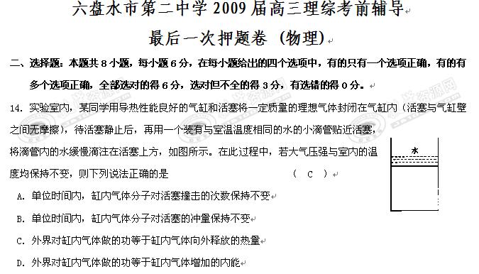 贵州省六盘水市第二中学2009届高三理综考前辅导最后一次押题卷 (物理)