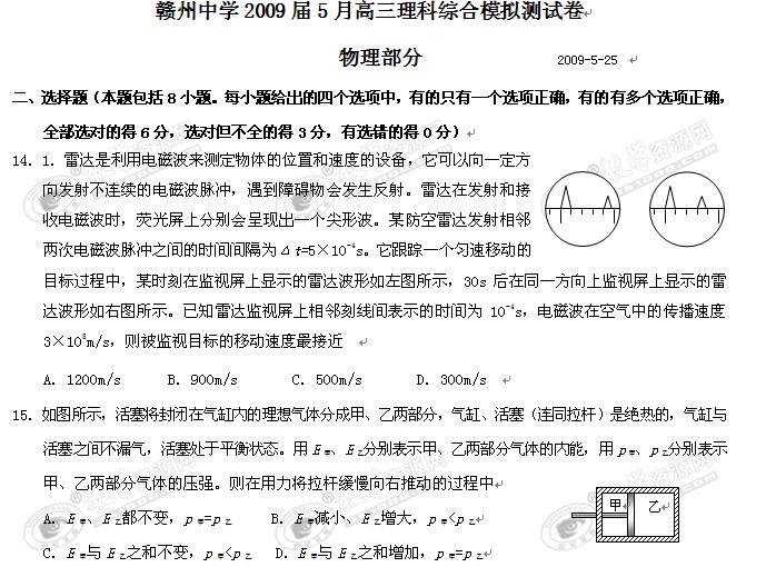 江西省赣州中学2008-2009学年高三5月综合模拟考试(物理)