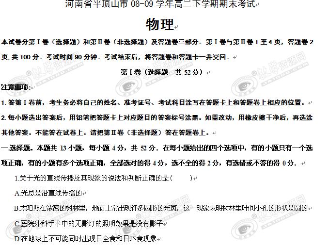 河南省平顶山市08-09学年高二下学期期末考试(物理)