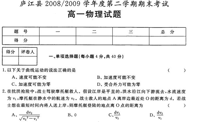 安徽省庐江县08-09学年高一下学期期末考试(物理)