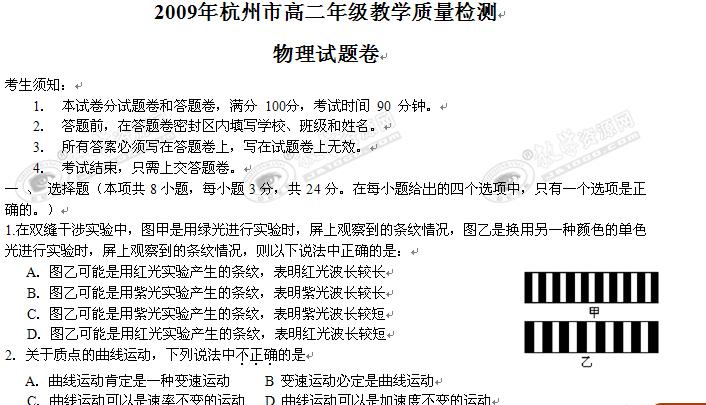 浙江省杭州市08-09学年高二下学期期末考试(物理)