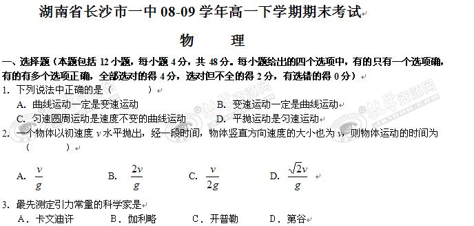 湖南省长沙市一中08-09学年高一下期期末考试(物理)