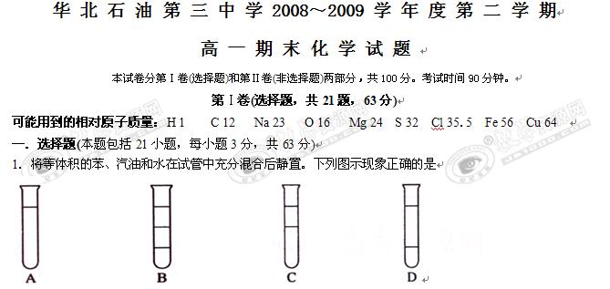 天津市华北石油第三中学08-09学年高一下学期期末考试(化学)