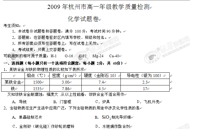 浙江省杭州市08-09学年高一下学期期末考试(化学)