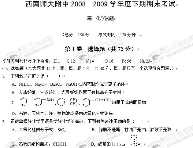 重庆西南师大附中08-09学年高二下学期期末考试(化学)