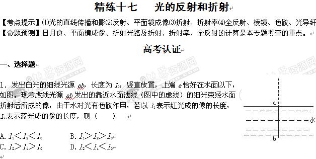物理:2010届高考物理一轮复习精练十七---光的反射和折射