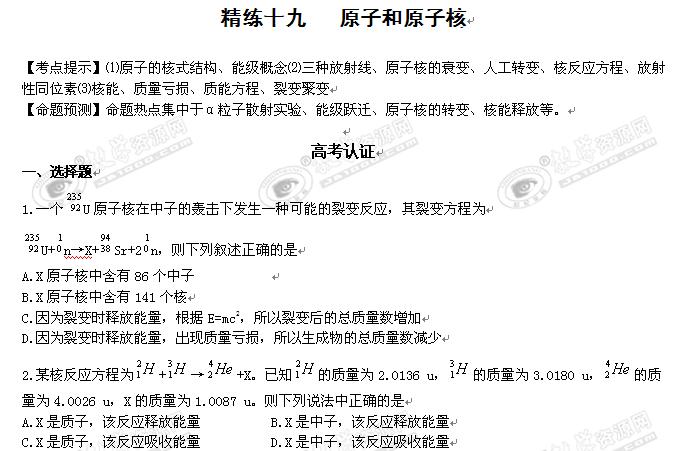 物理:2010届高考物理一轮复习精练十九---原子和原子核