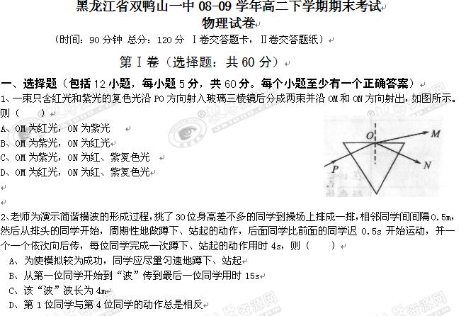 黑龙江省双鸭山一中08-09学年高二下学期期末考试(物理)