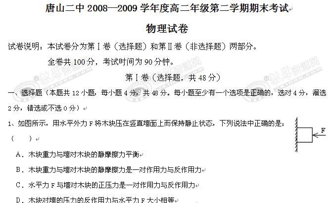 河北省唐山二中08-09学年高二下学期期末考试(物理)