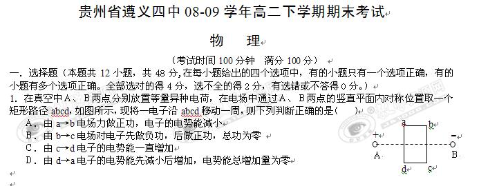 贵州省遵义四中08-09学年高二下学期期末考试(物理)