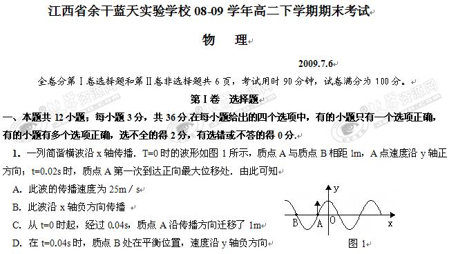 江西省余干蓝天实验学校08-09学年高二下学期期末考试(物理)