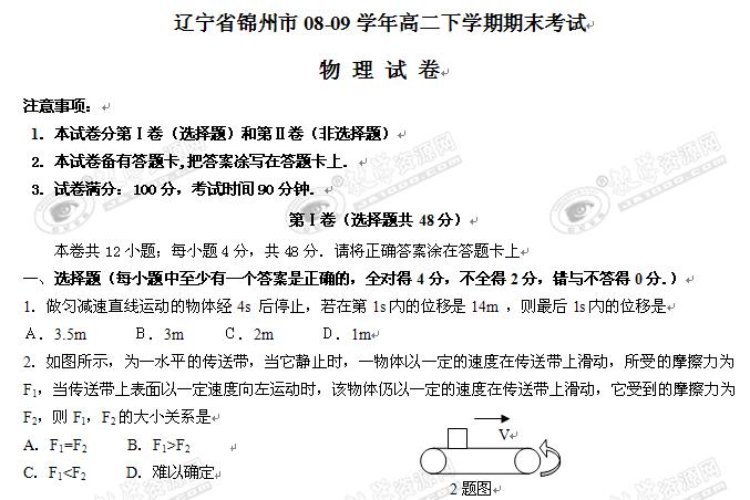 辽宁省锦州市08-09学年高二下学期期末考试(物理)