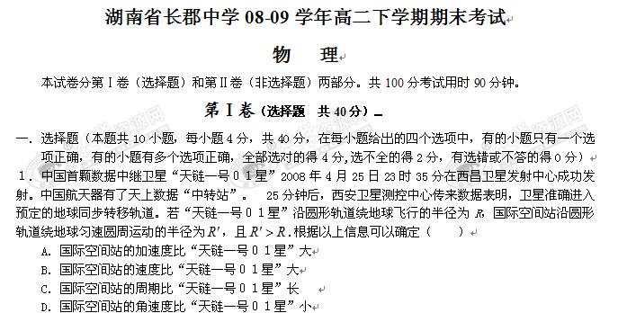 湖南省长郡中学08-09学年高二下学期期末考试(物理)