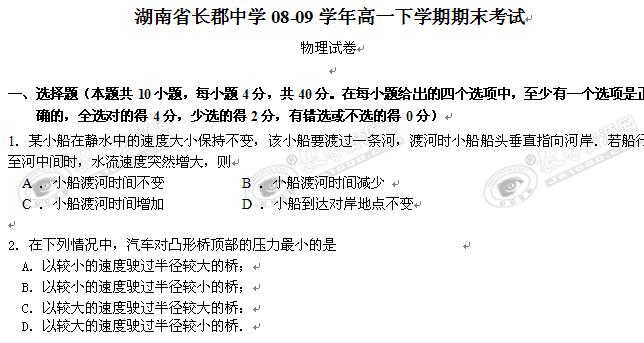 湖南省长郡中学08-09学年高一下学期期末考试(物理)