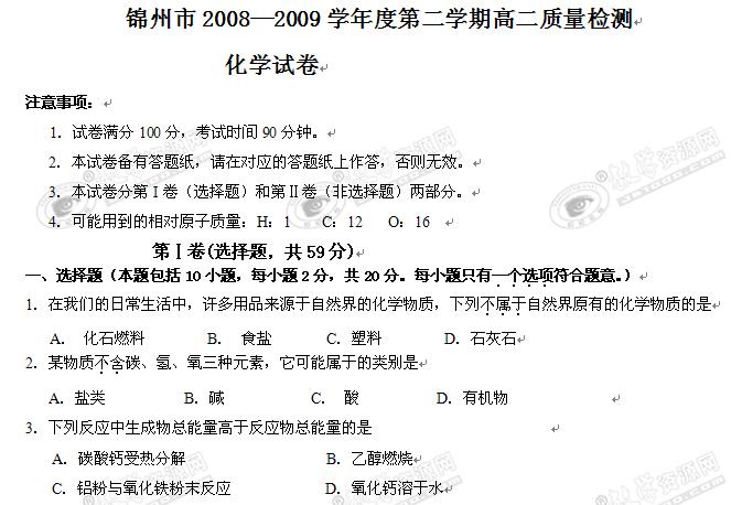 辽宁省锦州市08-09学年高二下学期期末考试(化学)