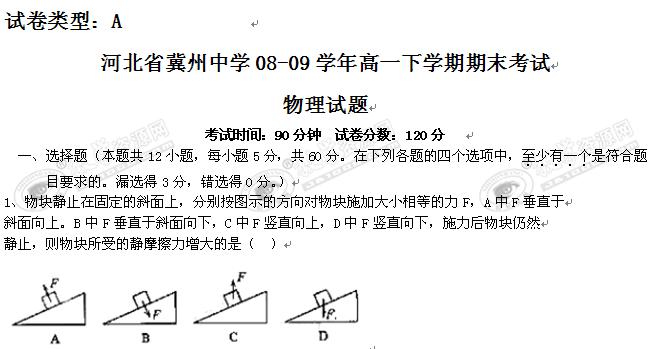 河北省冀州中学08-09学年高一下学期期末考试(物理)