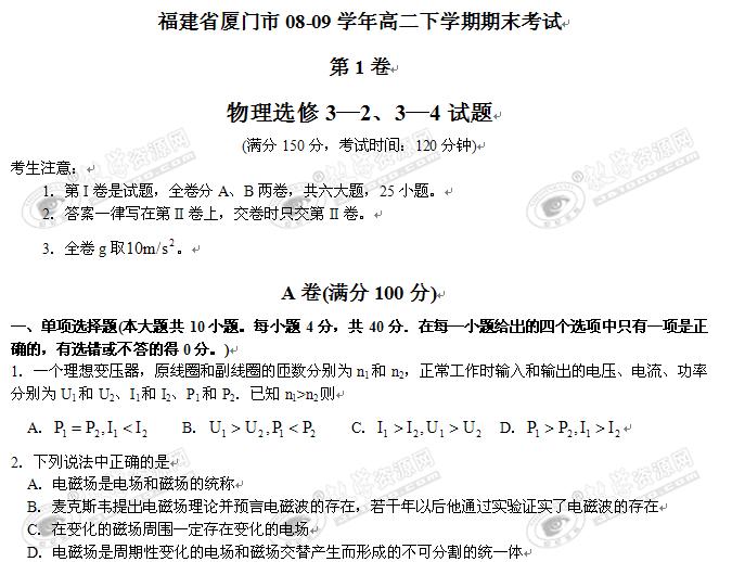 福建省厦门市08-09学年高二下学期期末考试(物理)