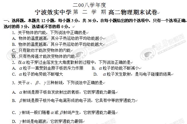 浙江省宁波效实中学08-09学年高二下学期期末考试(物理)