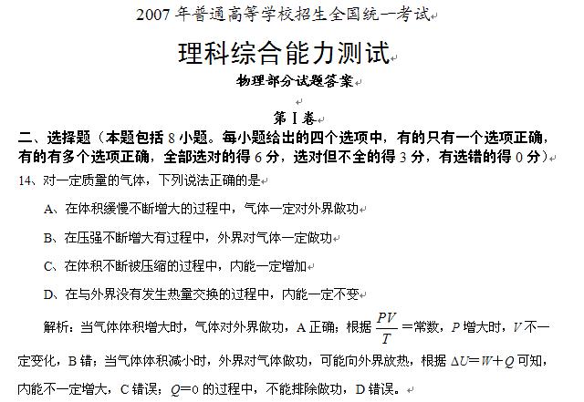 甘肃省2007年全国卷Ⅱ(物理部分逐题解析)