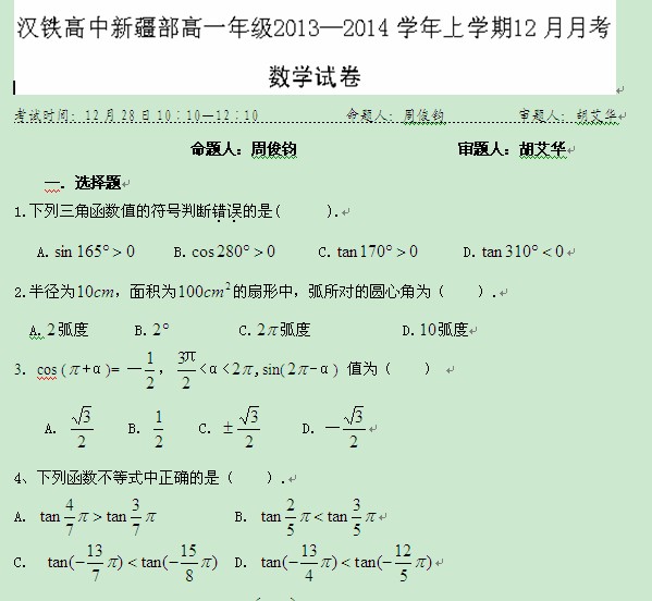 湖北省武汉市汉铁高级中学新疆部2013-2014学年高一12月月考(数学)Word版无答案