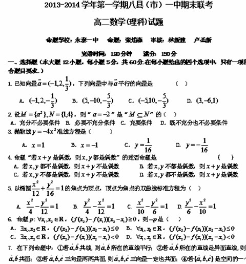福建省福州市八县2013-2014学年高二上学期期末考试(数学理)扫描版