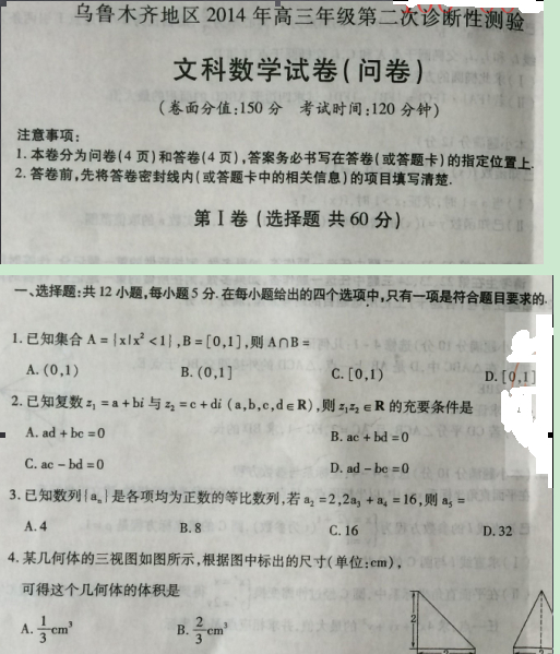 新疆乌鲁木齐地区2014届高三下学期第二次诊断性测验(数学文)扫描版含解析