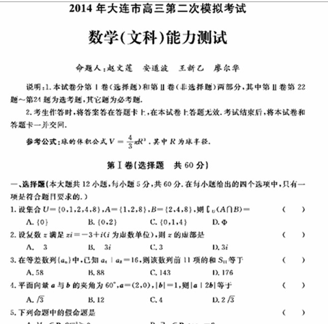 辽宁省大连市2014届高三第二次模拟(数学文)扫描版