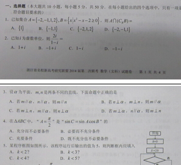 浙江省名校新高校联盟2014届第二次联考(数学文)扫描版