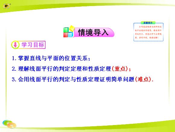 2013版高中数学全程学习夺冠方略多媒体教学课件:1.2.3 第1课时 直线与平面平行(苏教版必修2)