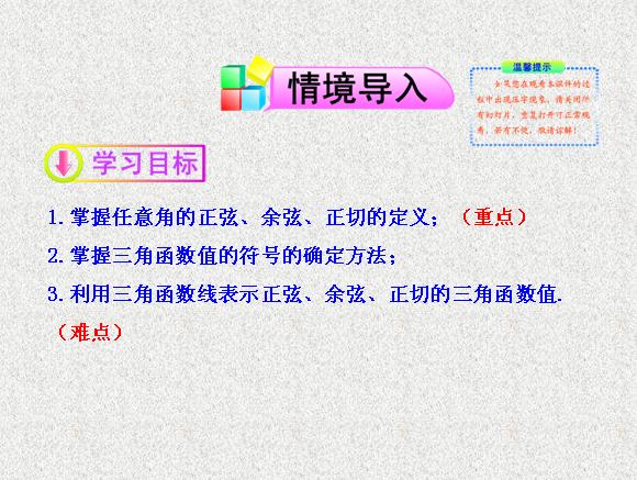 2013版高中数学全程学习夺冠方略多媒体课件:1.2.1 任意角的三角函数(苏教版必修四)