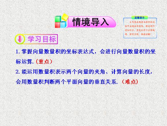 2013版高中数学全程学习夺冠方略多媒体课件:2.4 第2课时 向量数量积的坐标运算(苏教版必修四)