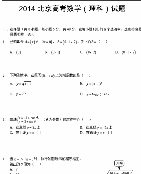 2014年普通高等学校招生全国统一考试北京卷(数学理)扫描版