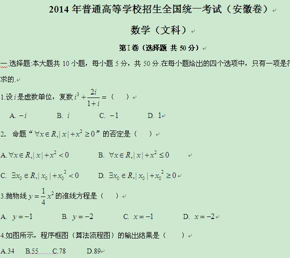 2014年普通高等学校招生全国统一考试安徽卷(数学文)Word版含答案