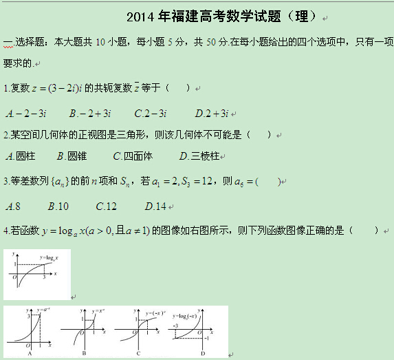 2014年普通高等学校招生全国统一考试福建卷(数学理)Word版含答案