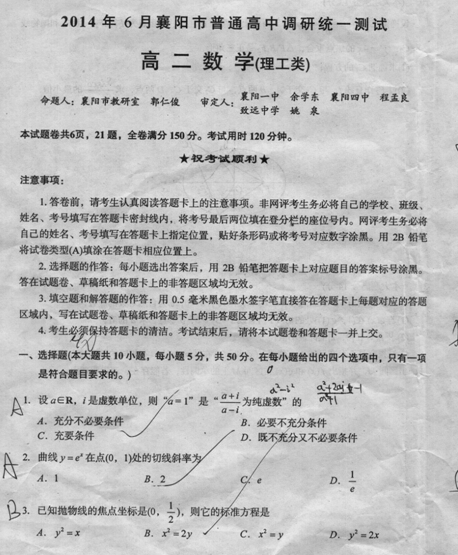 湖北省襄阳市普通高中调研统一测试2013-2014学年高二下学期期末考试(数学理)扫描版