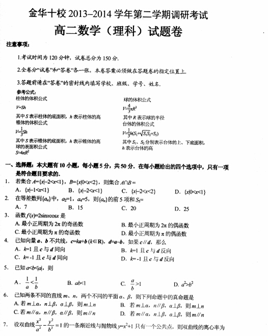 浙江省金华十校2013-2014学年高二下学期期末考试(数学理)扫描版
