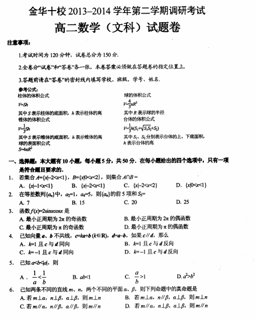 浙江省金华十校2013-2014学年高二下学期期末考试(数学文)扫描版
