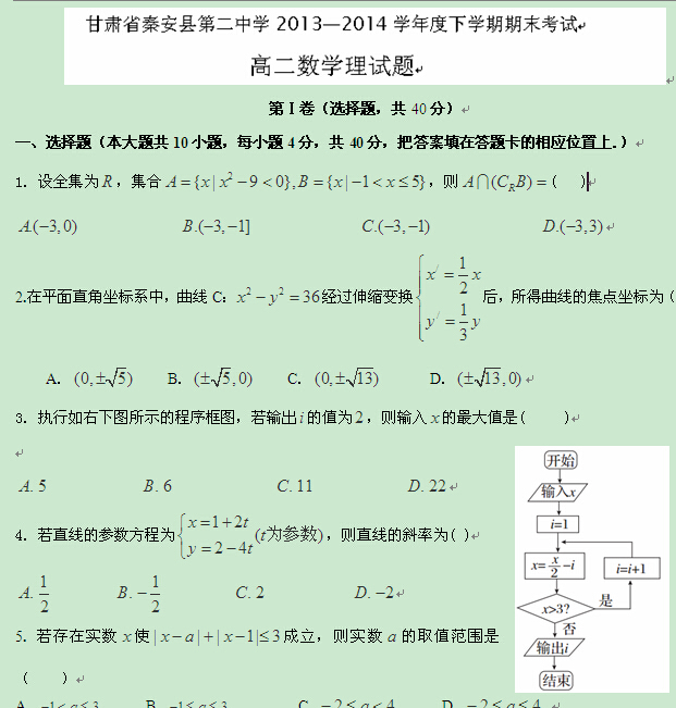 甘肃省天水市秦安二中2013-2014学年高二下学期期末考试(数学理)