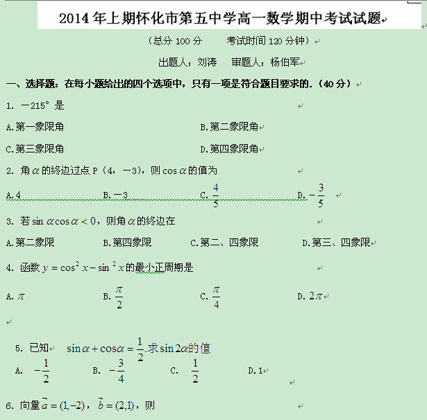 湖南省怀化五中2013-2014学年高一下学期期中考试(数学)