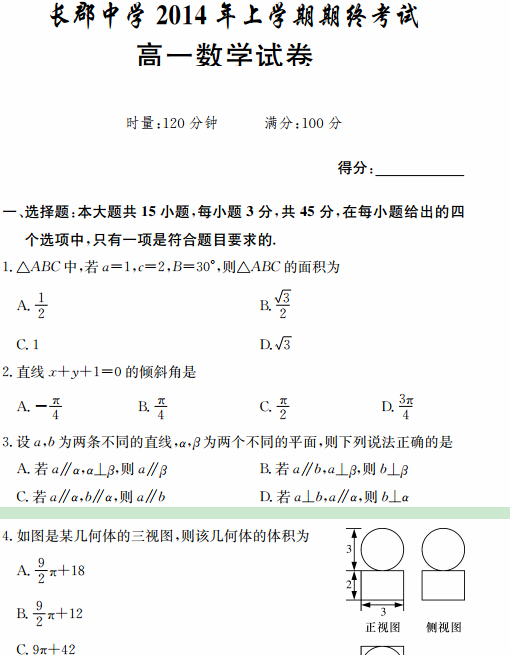 湖南省长郡中学2013-2014学年高一下学期期末考试(数学)扫描版含答案