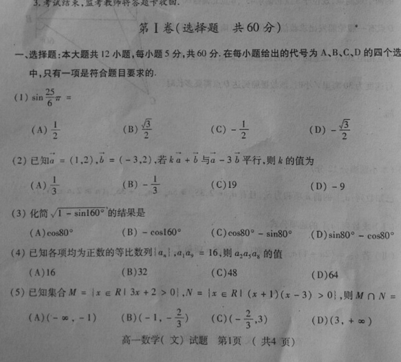 河南省驻马店2013—2014学年高一下学期期终考试(数学文)(扫描版)