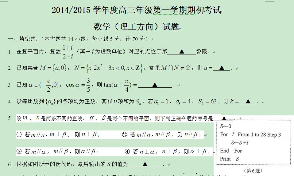 江苏省盐城市南洋中学2015届高三上学期期初考试(数学理)
