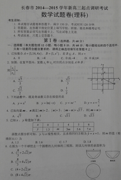 吉林省长春市2015届高三上学期第一次模拟考试(数学理)扫描版