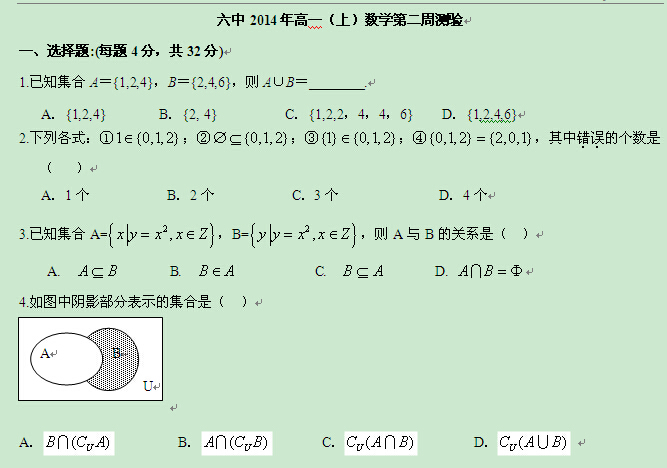 【全国百强校】广东省广州市第六中学2014-2015学年高一上学期9月第二周周四测验(数学)