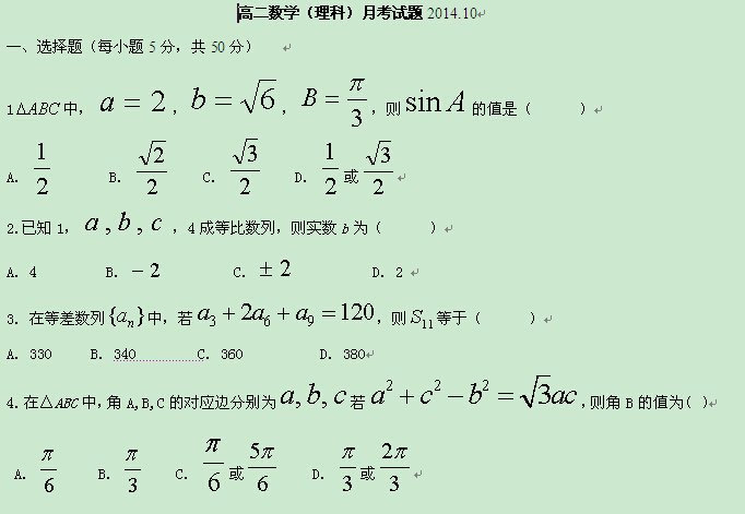 山东省临沂市某重点中学2014-2015学年高二上学期十月月考(数学理)