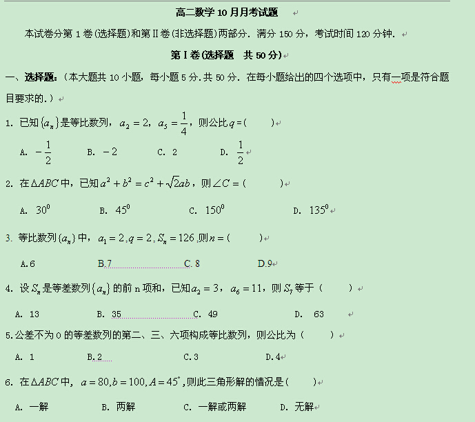 山东省临沂市某重点中学2014-2015学年高二上学期十月月考(数学文)